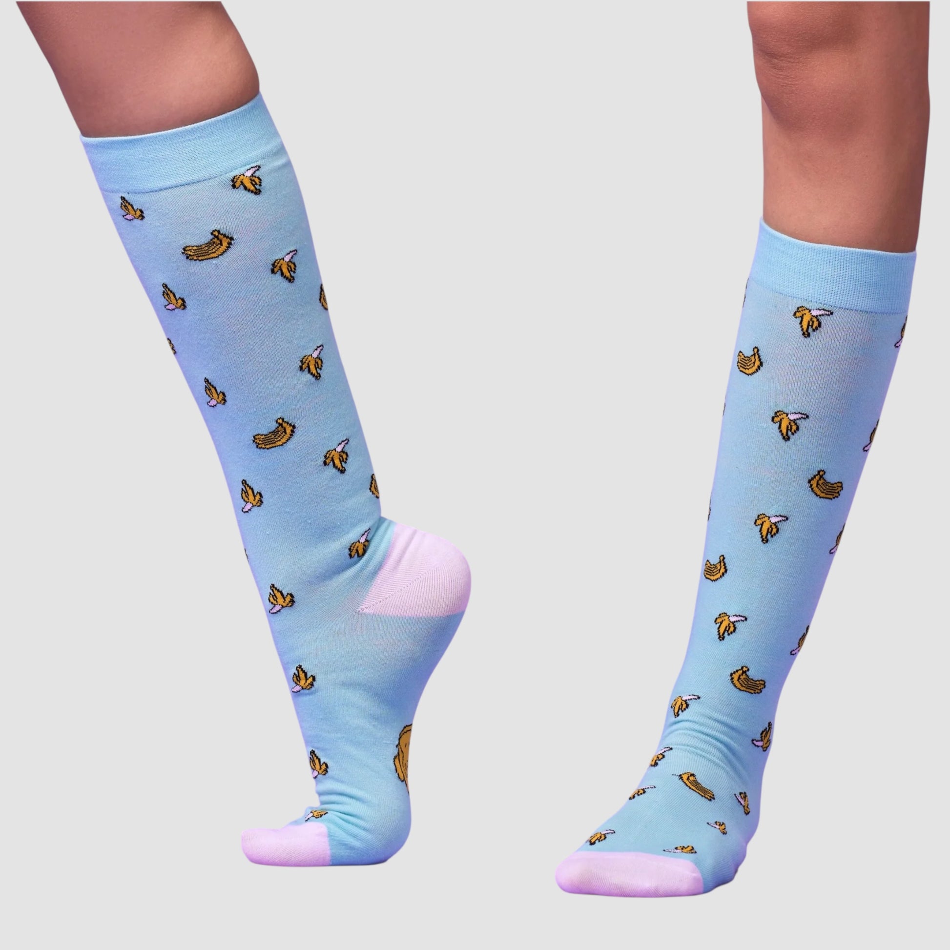 Un paio di Calzini Bob Esposito Banana con fondo tiffany, fantasia caschi di banane.