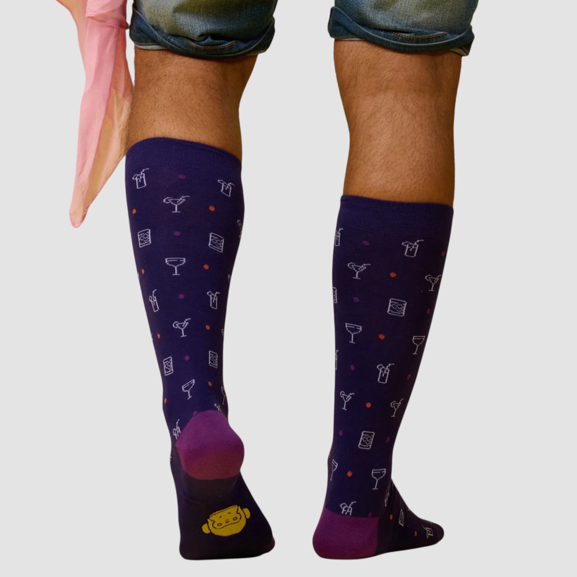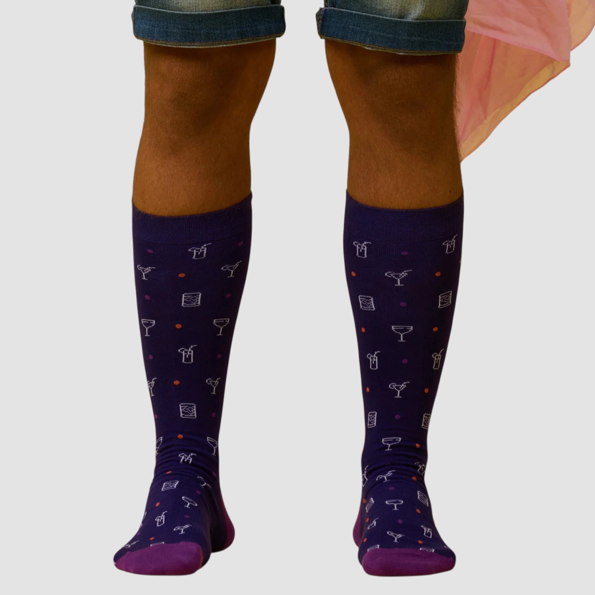 Un calzino che sa distinguersi con discrezione. Il Drink è pensato per chi ama la leggerezza con stile: fondo viola intenso, arricchito da piccoli disegni minimal di cocktail e drink iconici, per chi non rinuncia mai a un tocco di classe. Minimal ma d’effetto, è il calzino ideale per chi cerca un look elegante ma originale, senza prendersi troppo sul serio.