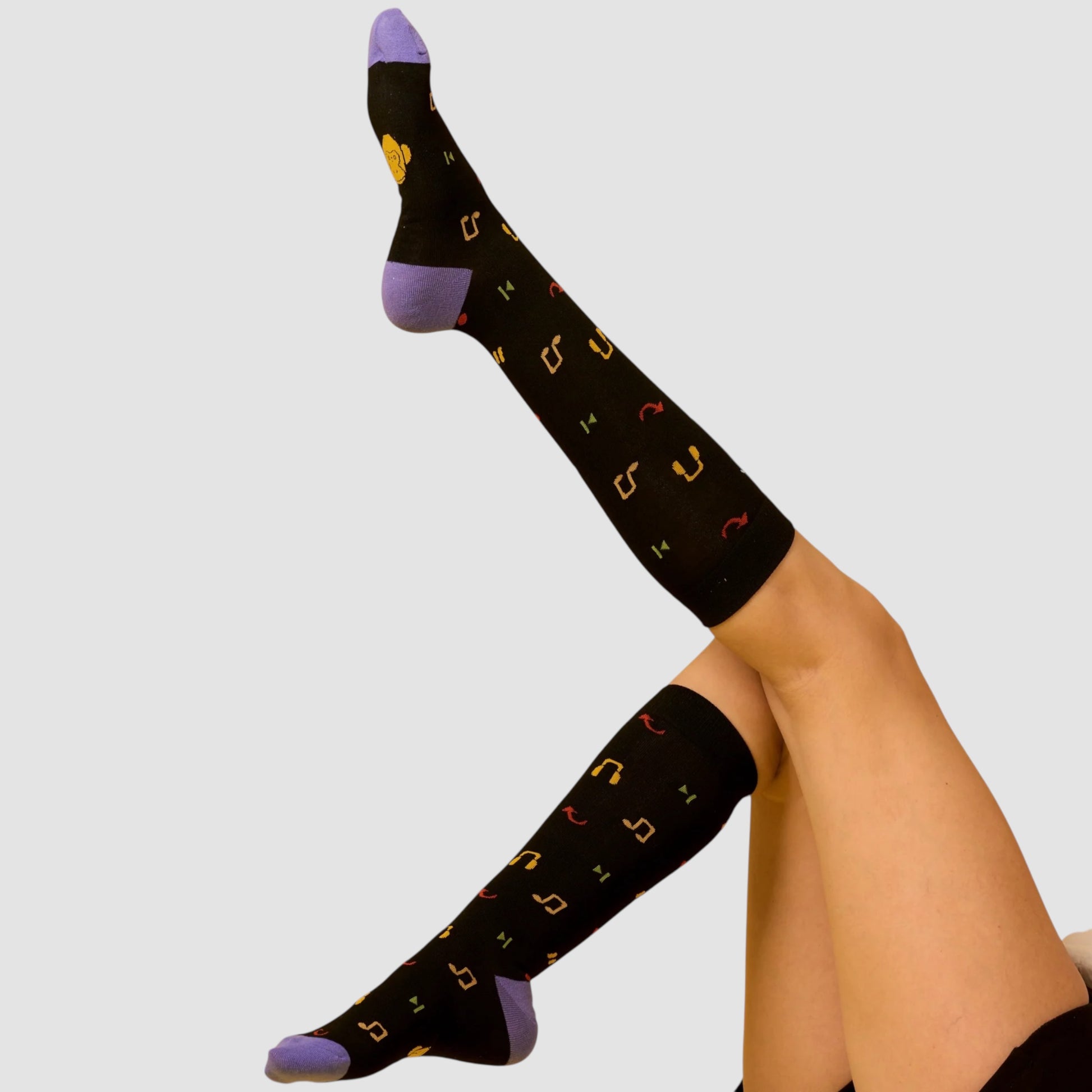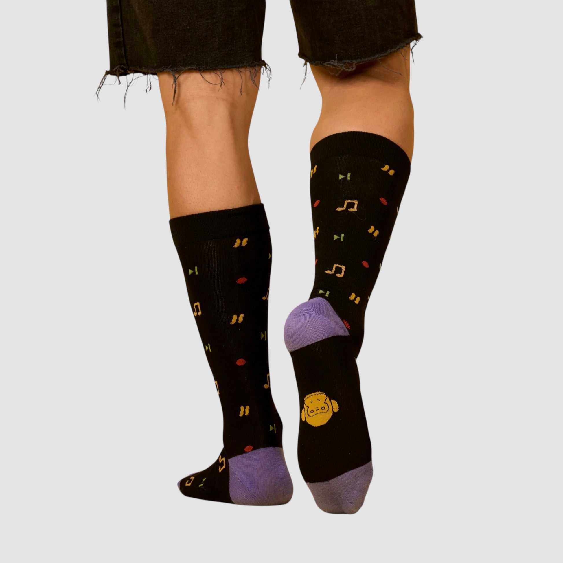 Un paio di Calzini Bob Esposito Music Lover con fondo nero, fantasia play music, note musicali e tasti display multifunzione radio.