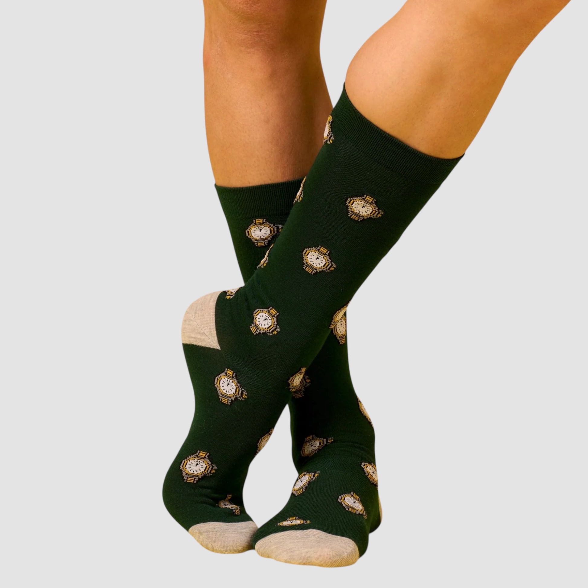 Un paio di Calzini Bob Esposito orologio con fondo verde, fantasia orologio da polso.