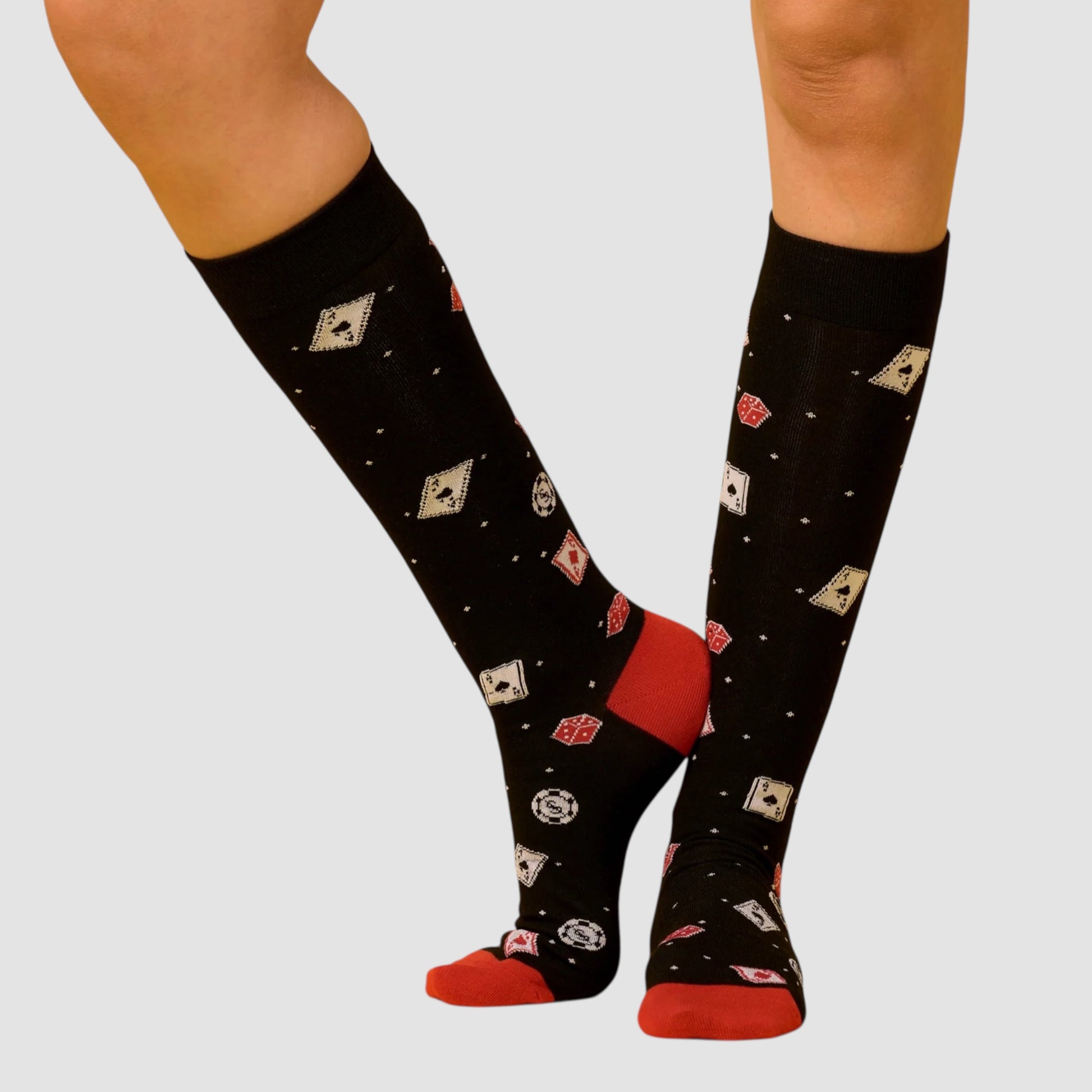 Un paio di Calzini Bob Esposito poker con fondo nero, fantasia con carte da gioco e fiches.