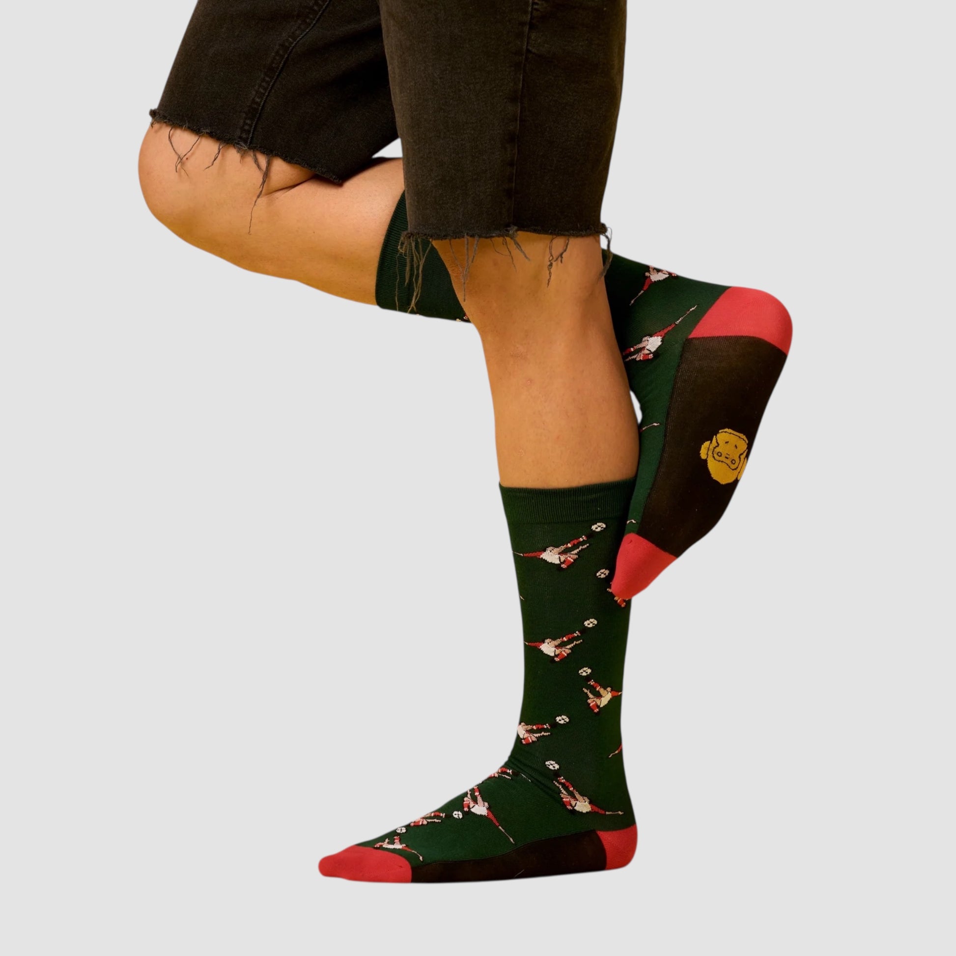 Un paio di Calzini Bob Esposito soccer con fondo verde, fantasia calciatore e pallone.