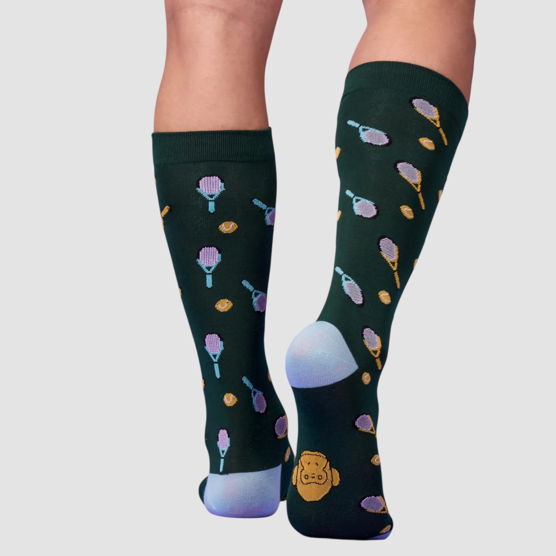 Un paio di Calzini Bob Esposito tennis con fondo verde, fantasia racchetta e pallina da tennis.
