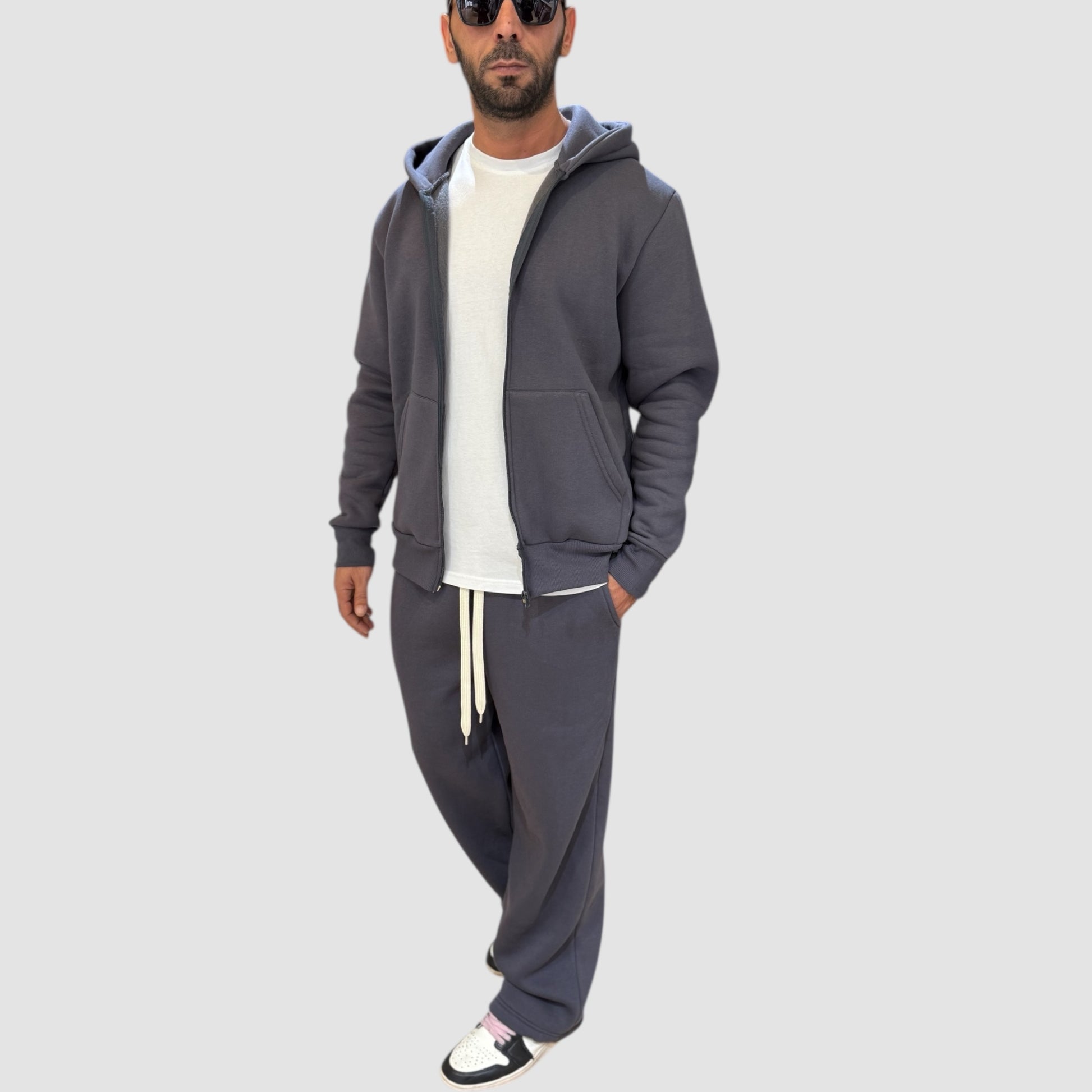 Coordinato tuta con cappuccio, tessuto all'interno felpato dalla vestibilità confortevole.
