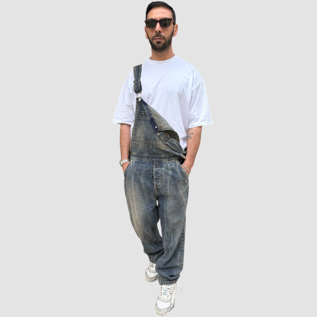 Salopette in jeans sabbiato, fondo ampio.